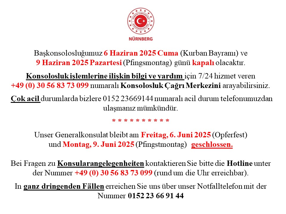 Başkonsolosluğumuz 6 Haziran 2025 Cuma (Kurban Bayramı) ve